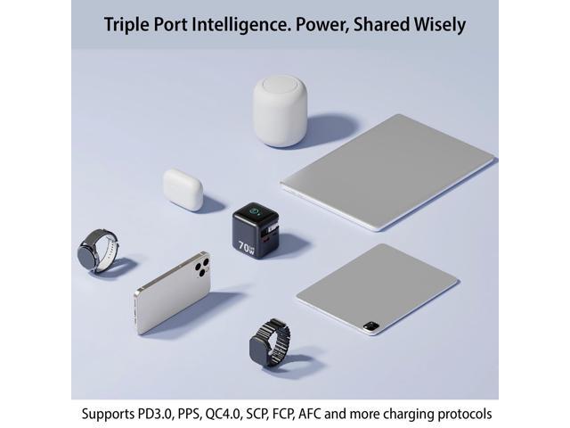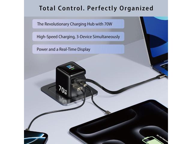 • Powerful 70W GaN 3 Charging: This wall charger utilizes advanced GaN 3 technology to deliver up to 70W of power for ultra-fast and efficient charging of laptops (Macbook,Galaxy Book4 Pro, IdeaPad, Vivobook,Chromebook, Pixelbook, XPS and more), tablets(iPad, Galaxy Tab, Pixel, Kindle Fire HD 10 and more), smartphones(iPhone 17/16/15/14/13/12/11, Galaxy S25/24/23/22/21) and more, and other electronic devices, ensuring fast and efficient power delivery.