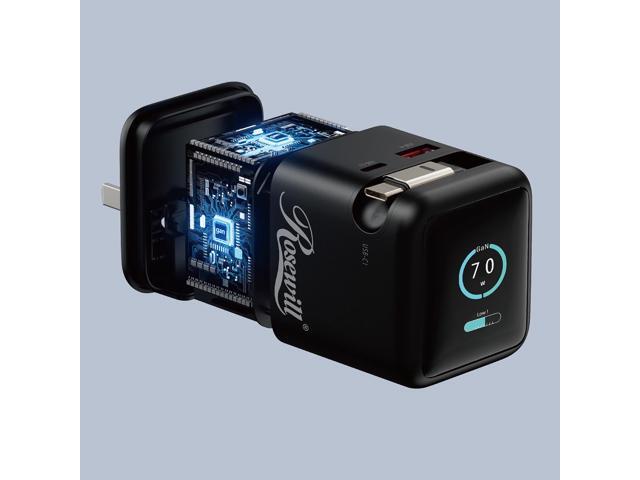 Rosewill 70W Retractable USB-C Wall Charger with Built-in Cable, 3-Port GaN 3 Fast Charging, Foldable Design & Real-Time TFT Display for MacBook, iPad, iPhone, Galaxy - Black