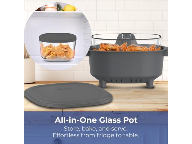 • All-in-One Glass Pot: 4.7QT glass pot ideal for family or party use. Features easy-grip handles on both unit and pot. Lid enables storage—store, bake, and serve in one container.